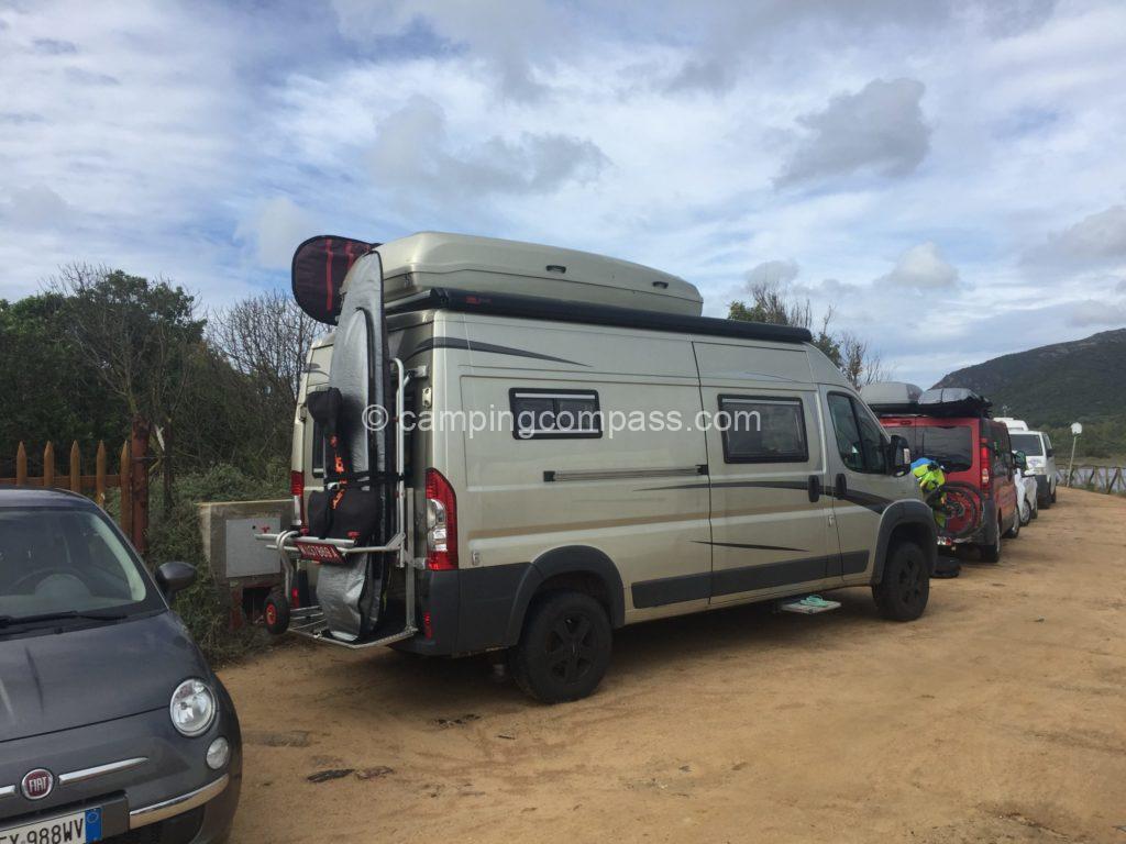 A rack for up to 5 bikes can be mounted on the rear wall of the motorhome or the rear door of the van. In most cases, the rack is made by Fiamma or Thule. Both work in a very similar way. The rack can also be used for drying wetsuits or attaching an additional box for other sports junk.