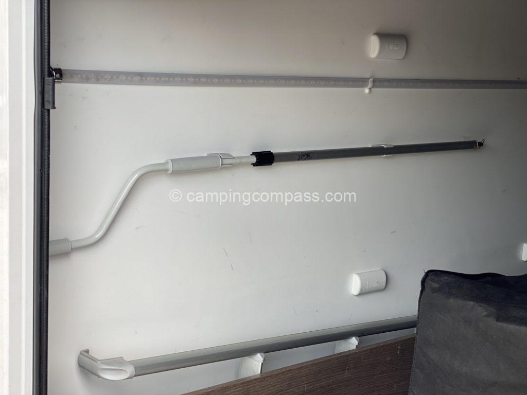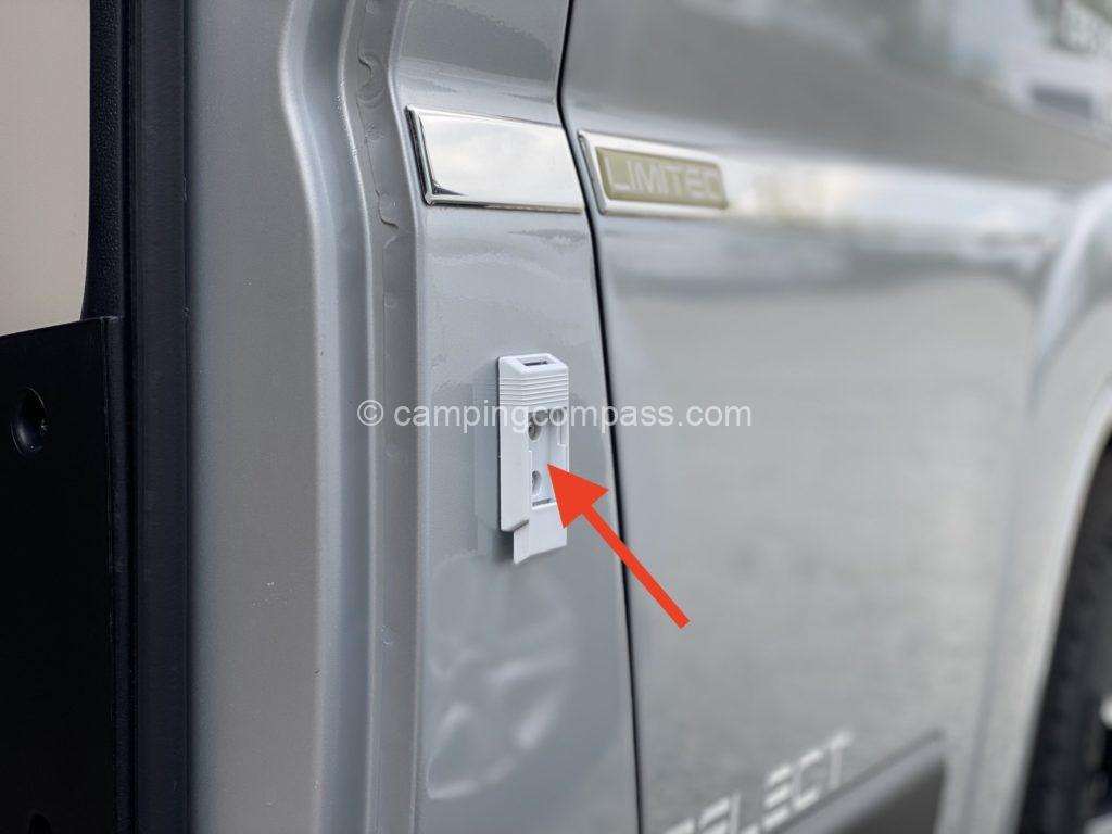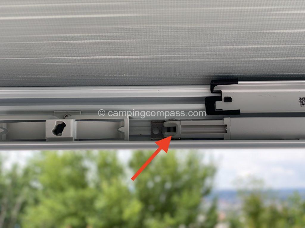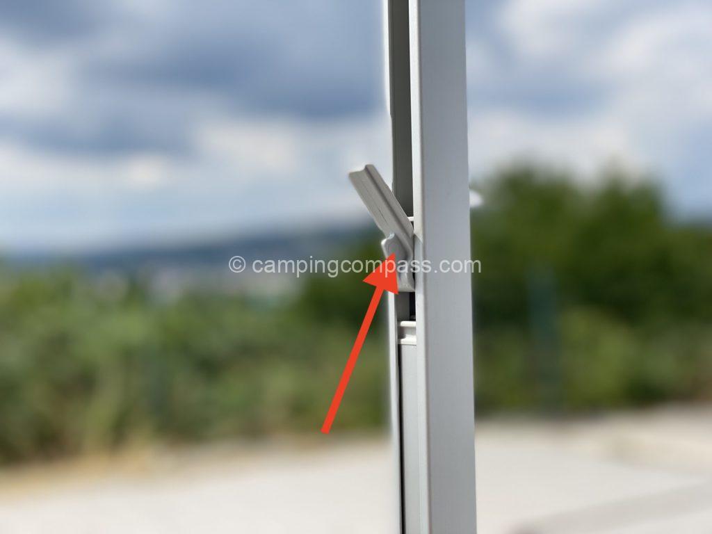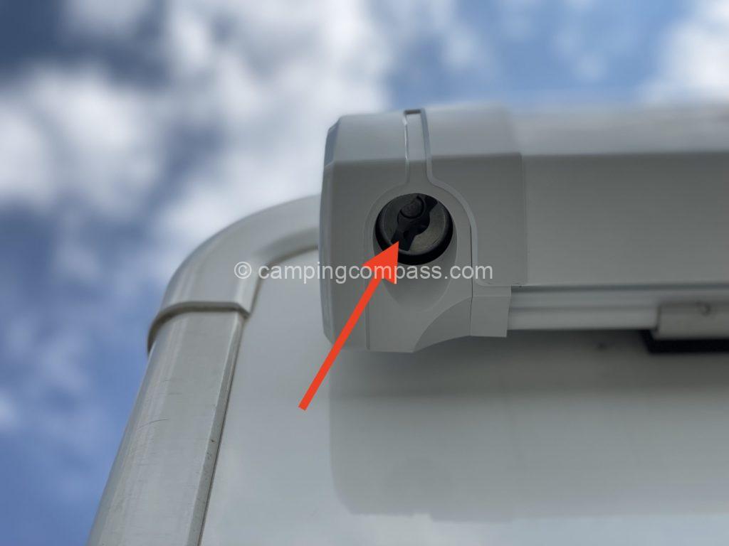 - For the Fiamma awning, hook the awning handle into the awning opening eye. For a Thule awning, insert the handle into the opening hole of the awning and turn the handle to secure.