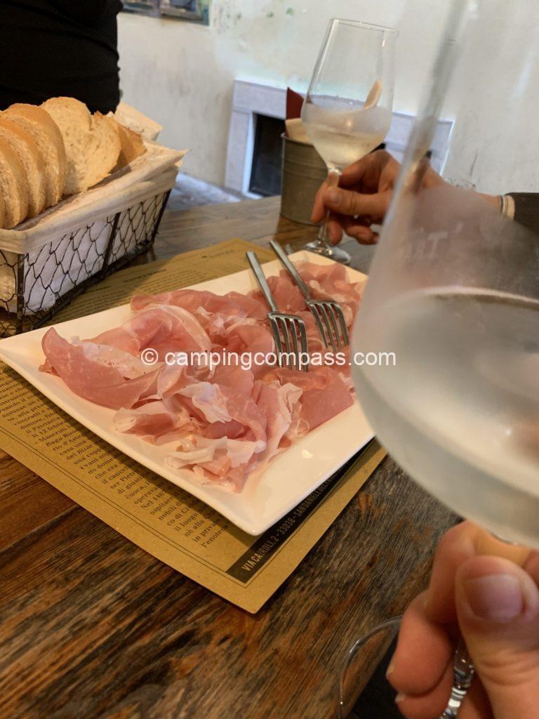 A stylish bar with a hidden alley. Outside you can sit on wooden benches. You can order a classic tasting plate with prosciutto and prosecco. But I’ve probably never eaten better San Daniele ham than right here at this Enoteca. They slice the ham on an old manual slicer, to nanometer-thick slices.